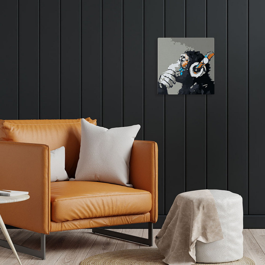 Model: Mini Paint by numbers Monkey wearing headphones 20x20cm already framed